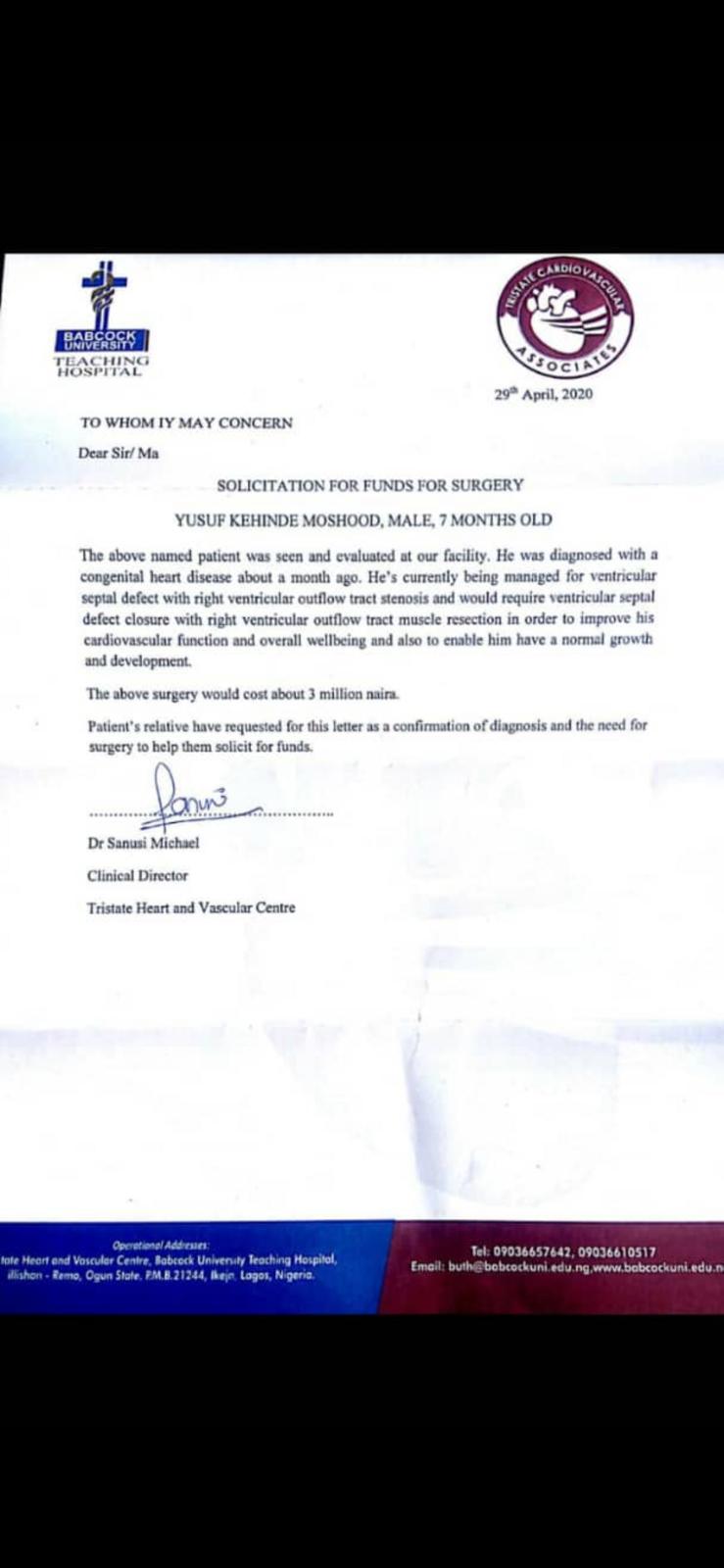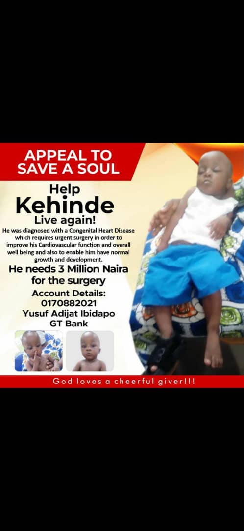 According to the medical report, he needs to undergo an urgent surgery to enable him have a normal growth and development, which will cost N3m (Three million naira).